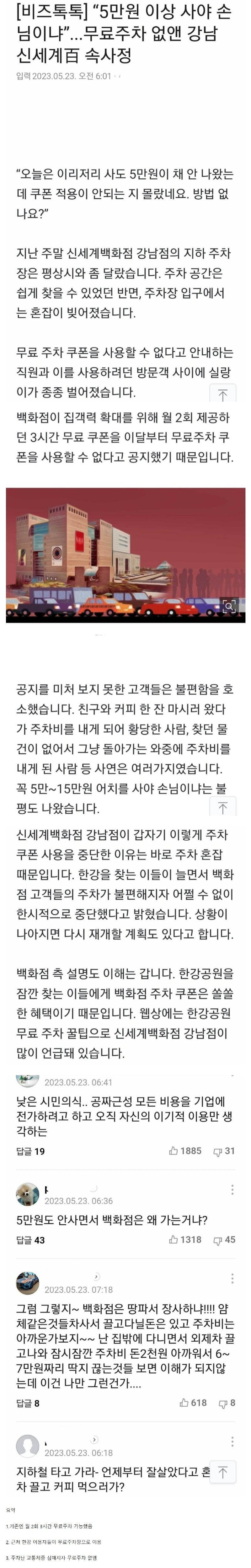 무료주차 없앤 강남 신세계 요약 1. 기존 월 2회 3시간 무료주차 2. 근처 한강 이용자들이 무료주차장으로 이용 3. 주차난 교통체증 심해지자 무료주차 없앰 그런데 몇달있다가 민원 심해져서 다시 원상복구 될듯 무료주차 없앤 강남 신세계 뉴스/오늘의 이슈 2023.05.25
