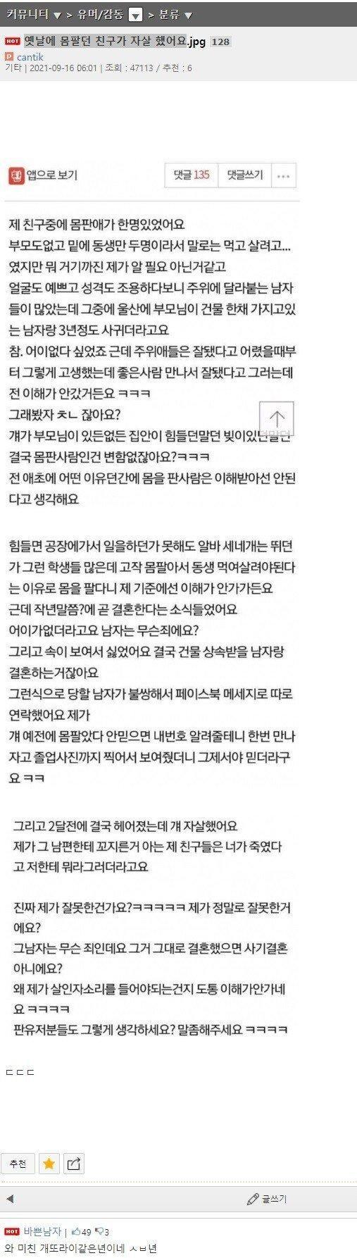 옛날에 몸팔던 친구가 결혼한다 해서 신랑에게 꼬질렀다? 옛날에 몸팔던 친구가 결혼한다 해서 신랑에게 꼬질렀다는 글쓴이 결국 친구는 극단적 선택을.... 그런데 자기가 뭘 잘못했는지 모르겠다고 합니다. 지 결혼 할때 신랑이랑 시부모 되는 분들한테, 니 친구들이 ,당신네 며느리 되는 사람이 함부로 입 놀려서 친구가 자살 했다고 말하면 그 당시 자살했던 친구의 심정을 조금이나마 알려나?? 뉴스/오늘의 이슈 2023.05.24