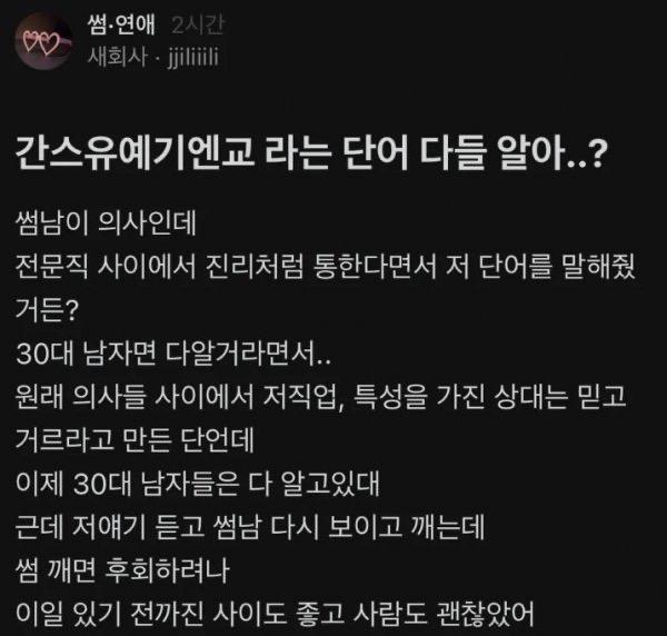 간스유예기엔교??가 뭘까? 간스유예기엔교 즉 간 - 간호조무사 스 - 스튜어디스 유 - 유치원교사 / 유학생 예 - 예체능 종사자 기 - 기독교 (특히 모태신앙) 엔 - NP (신경 정신병적 사고) 교 - 교사 (특히 초등교사) 추가 플 - 플로리스트 필 - 필라테스 강사 헤 - 헤어디자이너 네 - 네일아트 카 - 카페직원 직업에 귀천이 없다고 하지만.... 90% 이상이... 그런데 이걸 다 떠나서 이 중에 술먹고 담배핀다? 걸러야 됨 -펌- 뉴스/오늘의 이슈 2023.05.24