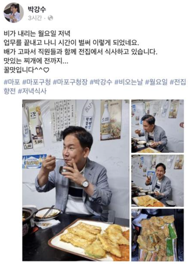 현재 서울 마포구청장 박강수청장이 욕을 먹고 있는 이유! 월요일 저녁... 무슨일이 있었나요? 서울이 물바다가 된 날입니다. 그런데 파전을 먹고 있는 모습을 페이스북에 올린 구청장... 뭐 밥먹는게 잘못된것은 아닙니다. 뭐가 잘못이 되었을까요? 댓글을 보시죠. ㅋㅋㅋ 수많은 댓글들 마포구청장의 페이스북은 성지순례 악의적인 댓글이라며 뭐가 잘못된지를 아직까지 모르고 있는 구청장 마지막으로 문재인 대통령을 존경하냐고 비꼬우는 구청장... 구청장의 가슴이 이렇게 작아서야... 참 부끄럽습니다. 이당 저당을 떠나서 꼰대의 마인드인지 뭐가 잘못되었는지를 모르는... 그냥 밥먹는 사진은 서민 코스프레하고 칭찬듣고 싶었는데 반응이 영 별로라서 빡치는 구청장