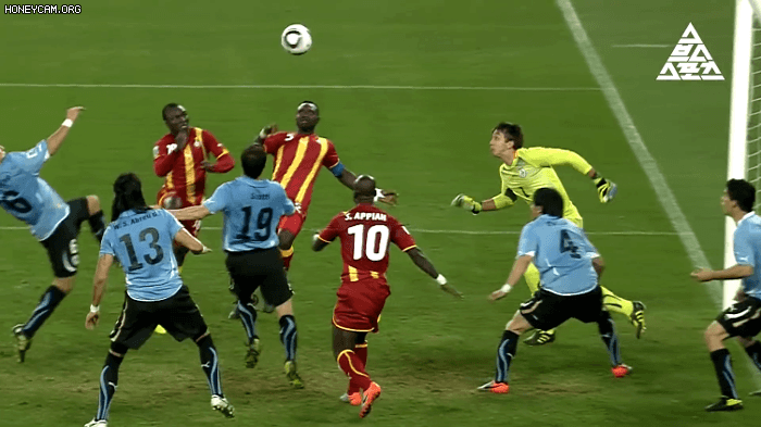 가나가 우루과이를 필사적으로 막는 모습이 찍혔습니다.