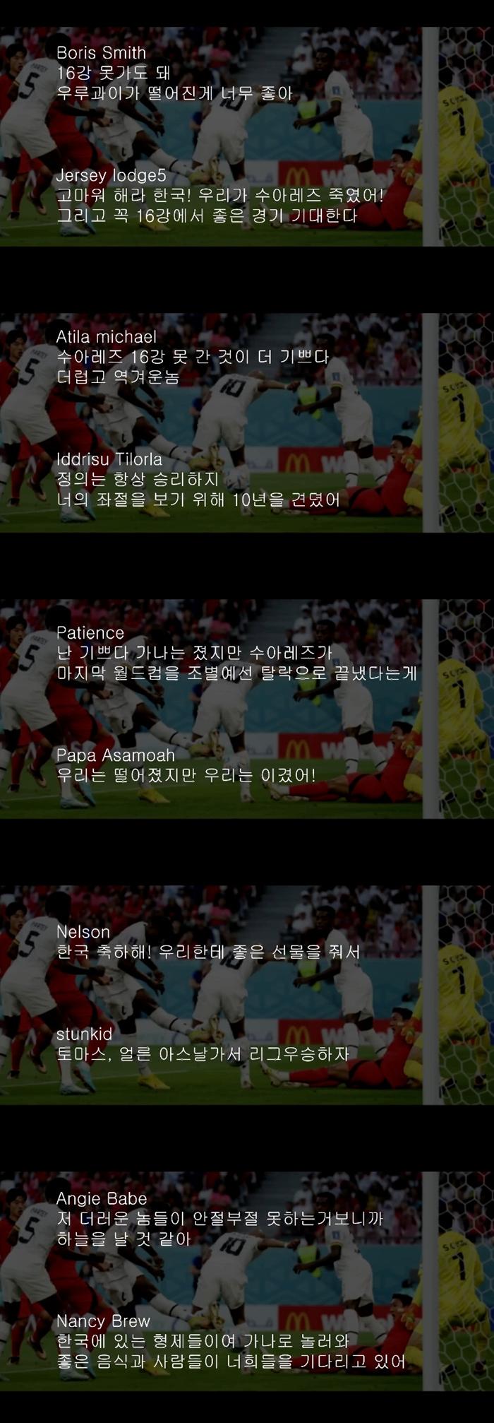 호히려 마지막에 황희찬의 역전골로 우루과이가 못올라가게 해줘서 한국에 고맙다고 하고 있습니다.