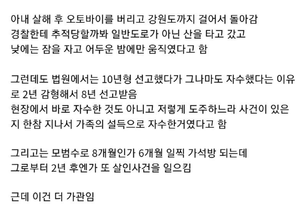 아내는 가해자가 찾지 못하도록 연고도 없는곳으로 도망을 갔는데... 어떻게 찾아서 목졸라 살해하고 소주병으로 시신을 훼손하기까지 했죠.