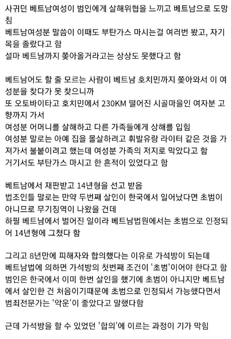 만약 한국에서 두번째 살인이라면 무기징역이 나왔을터이지만 베트남에서는 초범으로 인정이 되어 14년형...