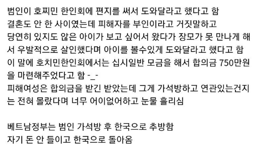 범인이 베트남 한인회에 편지를 써서 도와달라고 했다고 합니다.