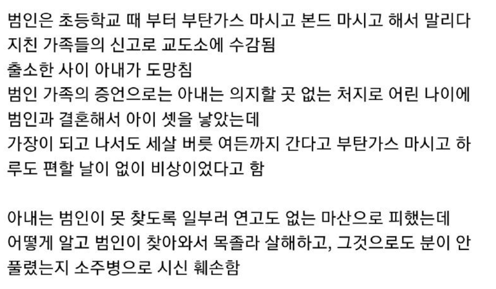 아내는 가해자가 찾지 못하도록 연고도 없는곳으로 도망을 갔는데... 어떻게 찾아서 목졸라 살해하고 소주병으로 시신을 훼손하기까지 했죠.