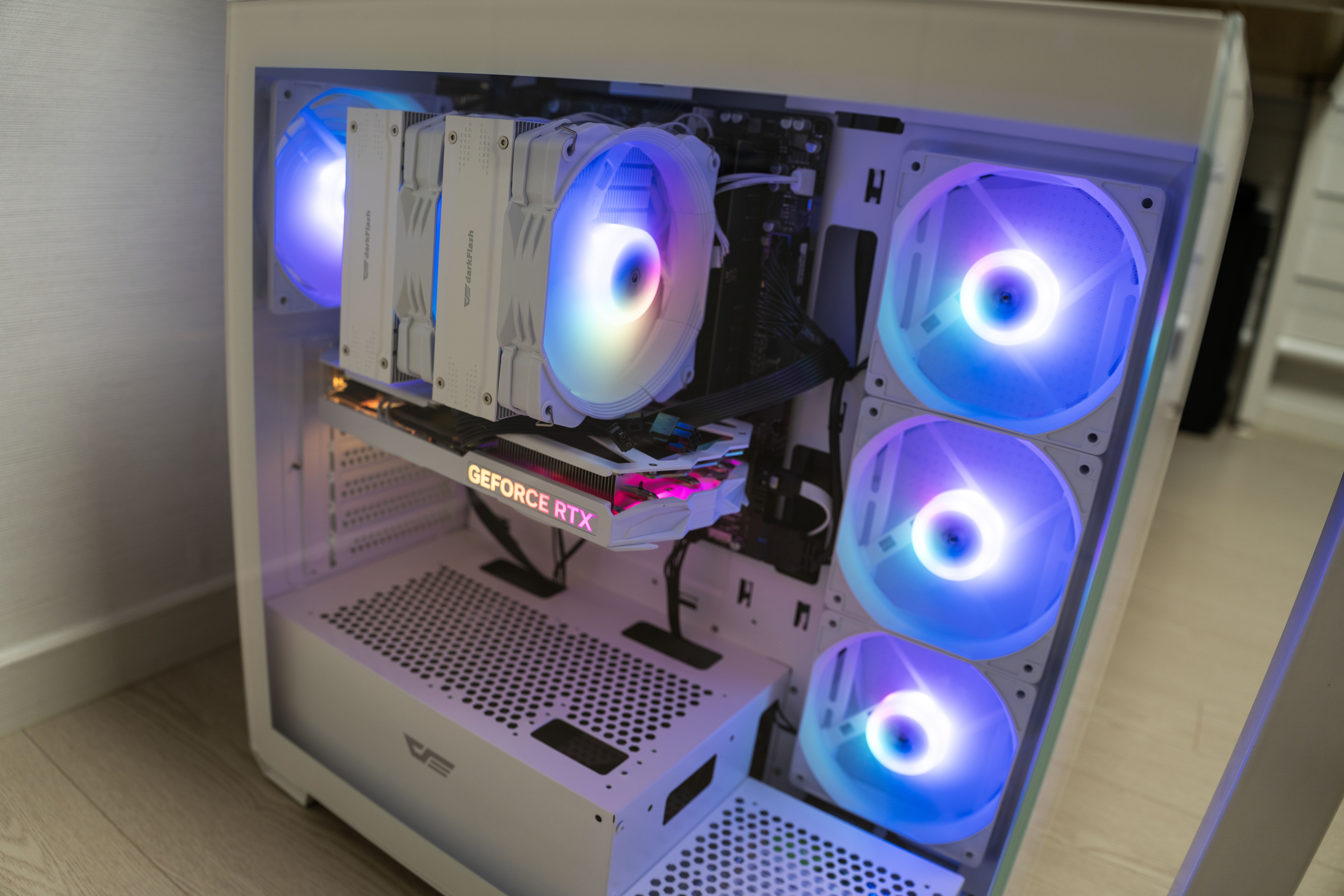 요즘 유행하는 어항케이스로 한번 구입해봤습니다. 확실히 이쁘네요. ㅎㅎ 다크플래쉬 DS900 ARGB 케이스는 뛰어난 통풍과 넓은 내부 공간을 제공합니다. 아름다운 ARGB 조명과 화이트 디자인으로 시각적인 만족감도 높습니다. 또 CPU쿨러와 케이스쿨러가 일체감이 있어 훨씬 보기 좋네요.