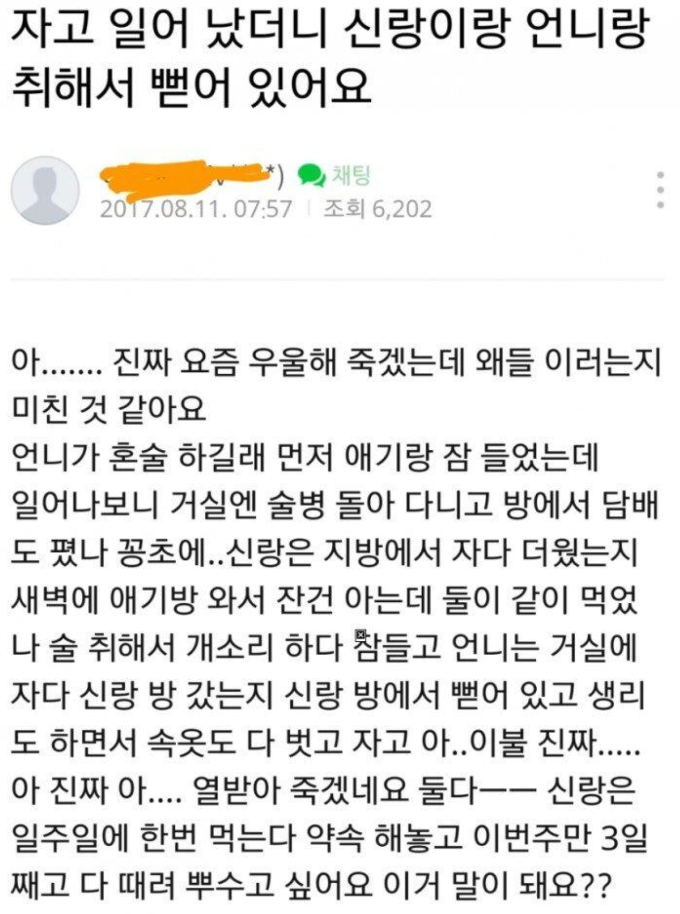 자고 일어났더니 신랑이랑 언니가 취해서 뻗어있다는 누리꾼의 사연 입니다.