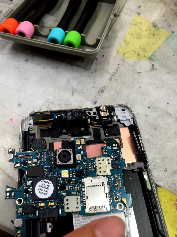 먼저, 공기계부터 분해를 시작했습니다. 노트3는 아이폰보다 수리하기 쉬운 편입니다. 아이폰은 별 드라이버와 뽁뽁이 등이 필요하지만, 노트3는 + 드라이버만 있으면 충분합니다. 뒷면 배터리를 분리하고 나사들만 풀면 쉽게 분해할 수 있습니다.