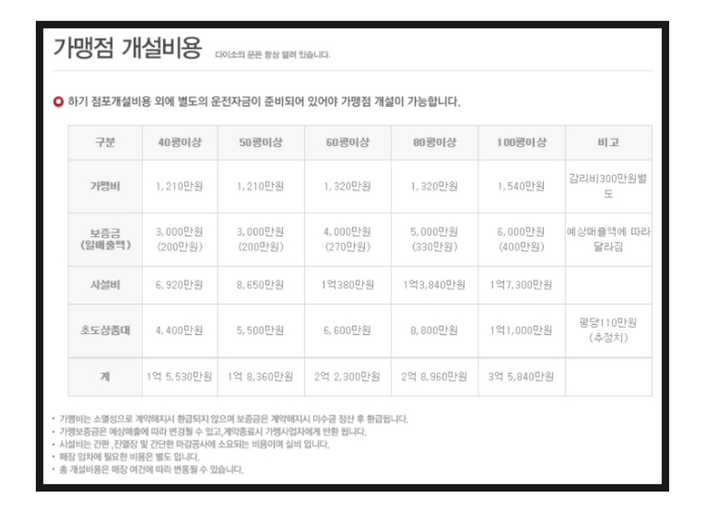 가맹점 개설 비용은 매장 평수와 예상 매출에 따라 변동됩니다. 아래 예시는 다이소에서 제시한 표 일부를 발췌한 것입니다.