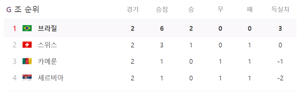 현재 G조 1위는 브라질!
