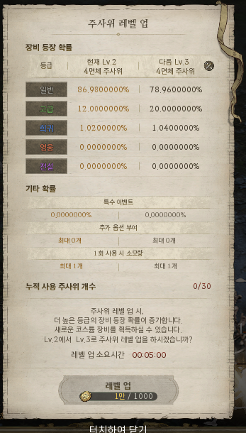 주사위를 돌려야 레벨업, 레벨업해야 고등급 나오고, 그걸 위해 시간, 골드를 쏟아부어야 하는 구조. 5시간 플레이했는데 겨우 주사위 10렙 정도 올렸고, 전설은커녕 영웅 등급도 구경하기 어렵습니다.