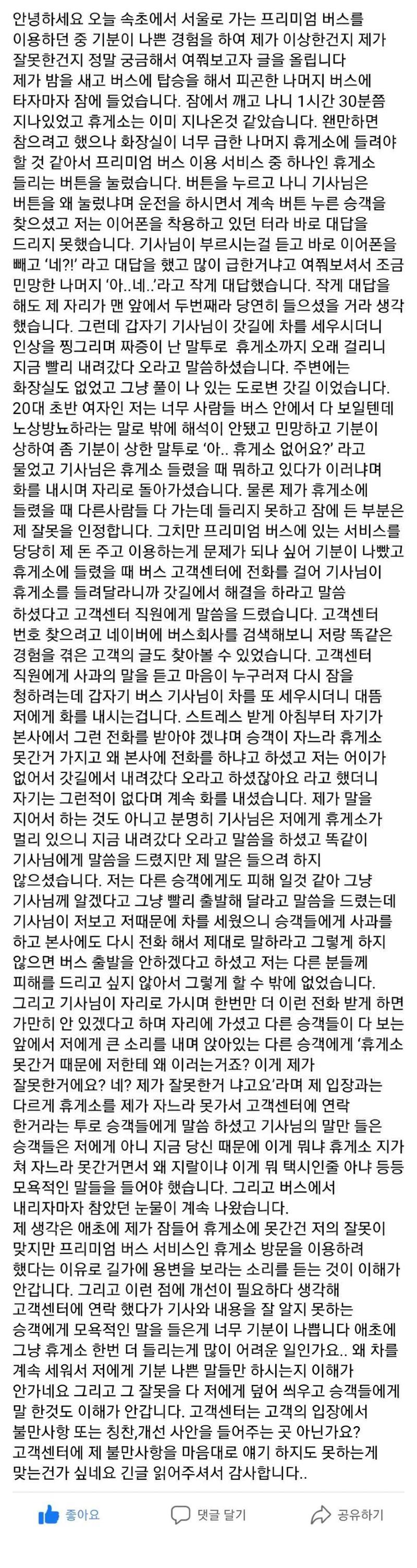 1. 프리미엄 버스 탄 글쓴이가 자느라 휴게소를 놓쳐서 휴게소 버튼 누름 (프리미엄 버스 서비스)