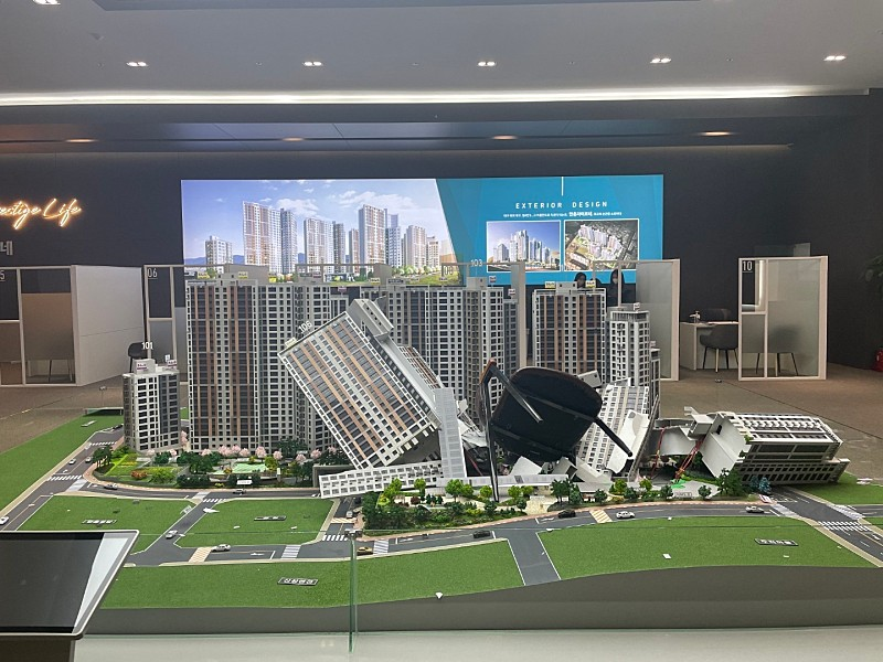 모델하우스 내 아파트 단지모형인데 누군가가 의자를 던져 부셔버렸습니다.