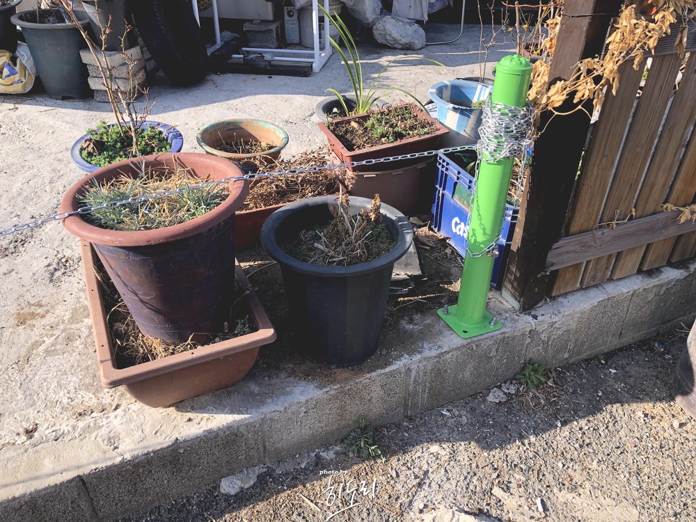 메쉬휀스 기둥을 박고 **체인(쇠사슬)**을 연결해 최소한의 담장 역할을 하게 만들었습니다.