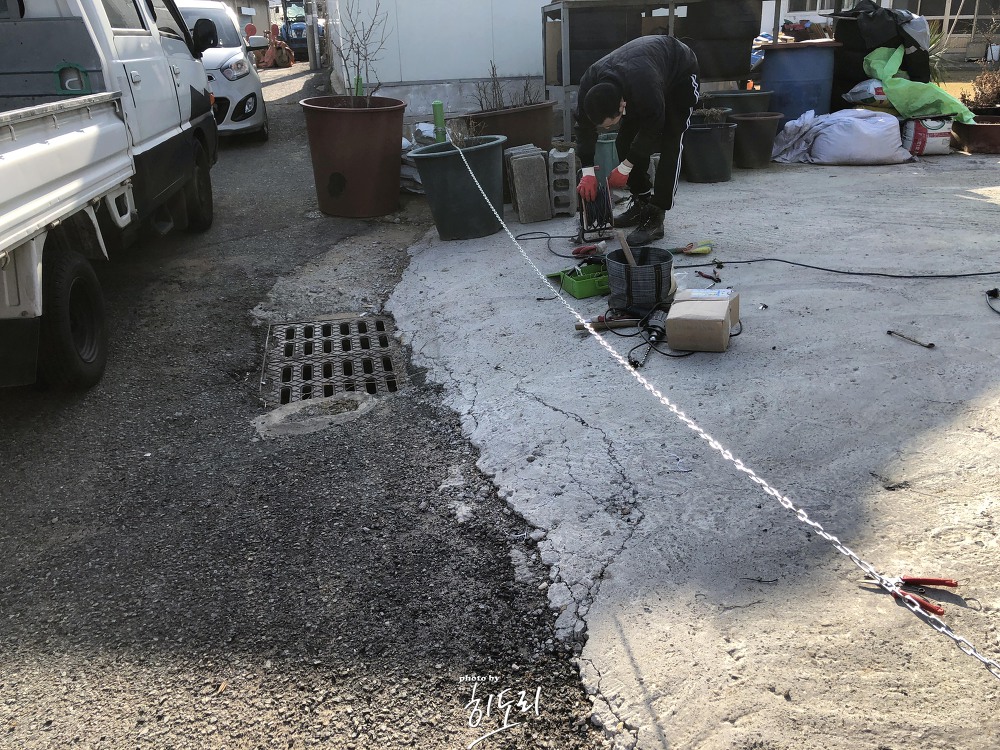 - 천공 작업 → 해머드릴로 약 50mm 깊이 뚫기