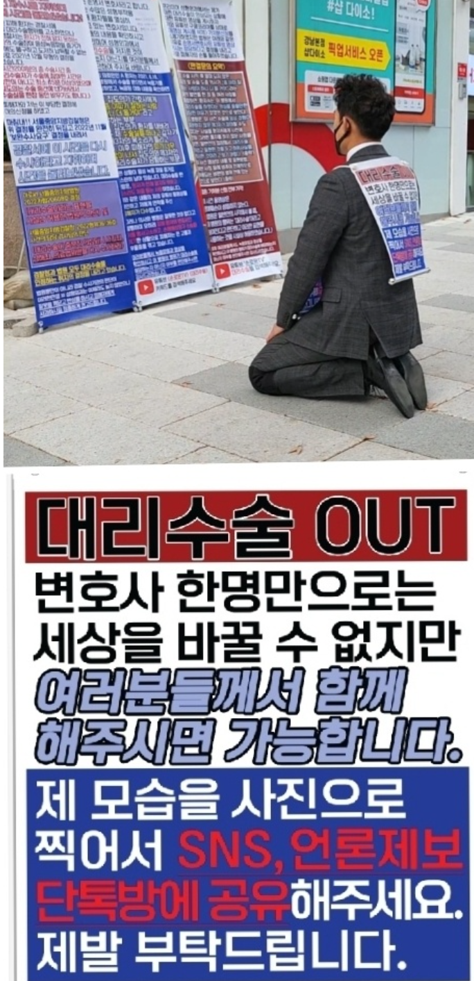 변호사가 성형외과에서 무릎꿇고 있는 사진이죠.