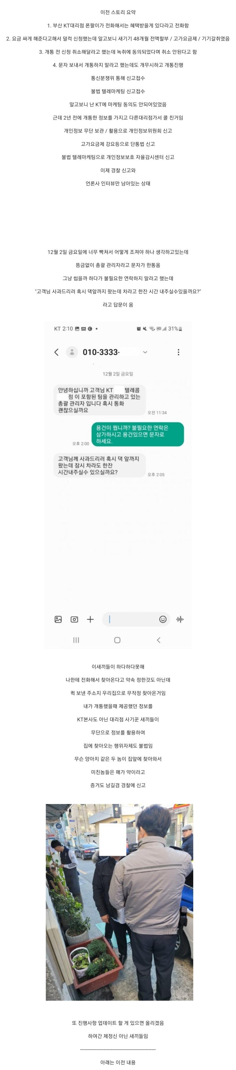 KT 부산 모 대리점 직원들은 본사에 마케팅 거부가 되어 있어서 전화하면 안되는 저에게 전에 가입했던 개인정보를 KT 몰래 불법 보관하고 있다가 개통했던 지점도 아니고 다른 대리점에 개인정보를 주고 받아 나에게 불법 텔레마케팅을 했습니다.