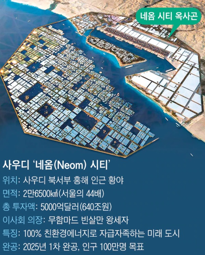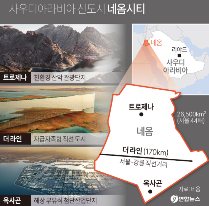 빈 살만 왕세자가 2017년 석유 중심의 경제 구조를 탈피하기 위해 발표한 초대형 신도시 사업이자 국가 장기 프로젝트(사우디 비전 2030)