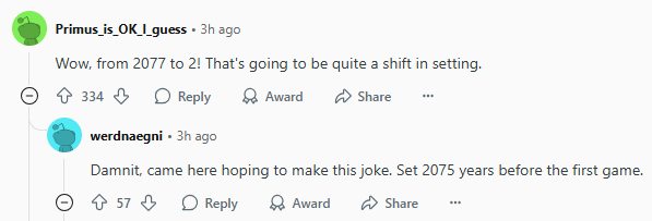 팬들 사이에서는 "2077에서 2로 가면, 2075년 전 이야기인가?" 같은 농담도 오가고 있는데요,