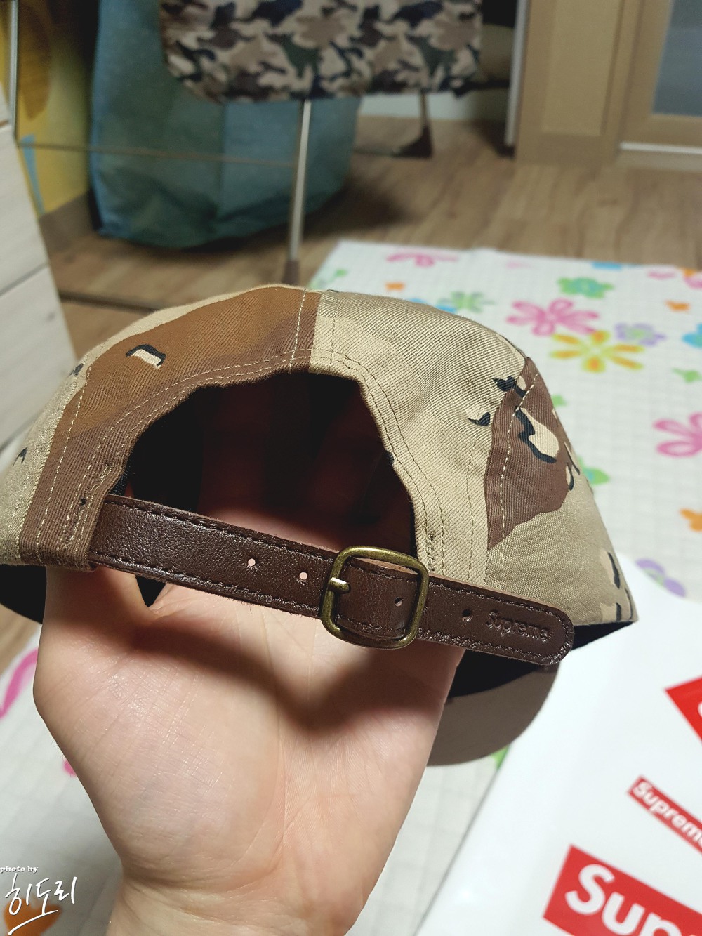다음은 슈프림 워시드 치노 트윌 캠프캡 카모입니다. 브라운 카모 패턴으로 만들어져 있으며, 뒷쪽 스트랩은 가죽 소재로 꽤 고급스럽게 만들어져 있습니다. 레자 같은 재질이 아닌 진짜 소가죽 재질입니다. 슈프림 워시드 치노 트윌 캠프캡은 진짜 캠프캡의 기본 중에 기본이라 할 수 있습니다. 화려해 보이지만 아주 무난하게 착용이 가능한 브라운 카모입니다. 그리고 캠프캡을 사는 이유는 머리 안 감고 외출하기 위함이죠! 시크한 척!