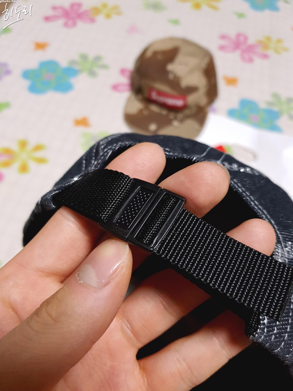 첫 번째로 슈프림 데님로고 캠프캡 블랙의 상세 컷입니다. 두꺼운 블랙 데님 소재에 곳곳에 스티치로 슈프림 로고가 박혀 있습니다. 뒷쪽 끈 조절 부분은 검정 가죽 소재였으면 더욱 좋았을 것 같지만, 일반 캔버스 타입의 소재로 되어 있습니다. 신기한 것은 버클 타입이라 원하는 사이즈를 자유자재로 만들 수 있어 꽤 괜찮았습니다. 탭 부분은 USA로 프린팅 되어 있습니다.