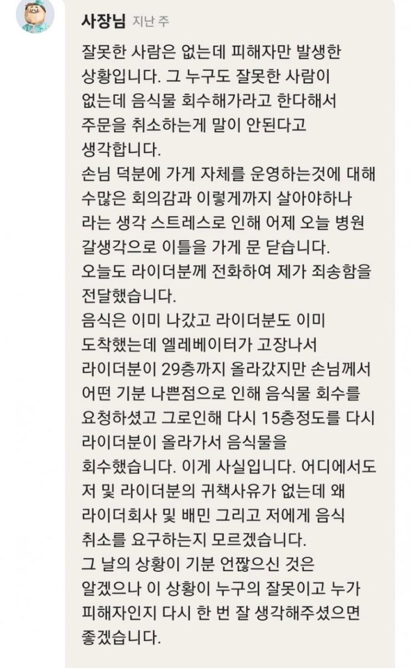 누구의 잘못이고 누가 피해자인지 다시 한번 잘 생각해주셨으면 좋겠다라는 사장님...