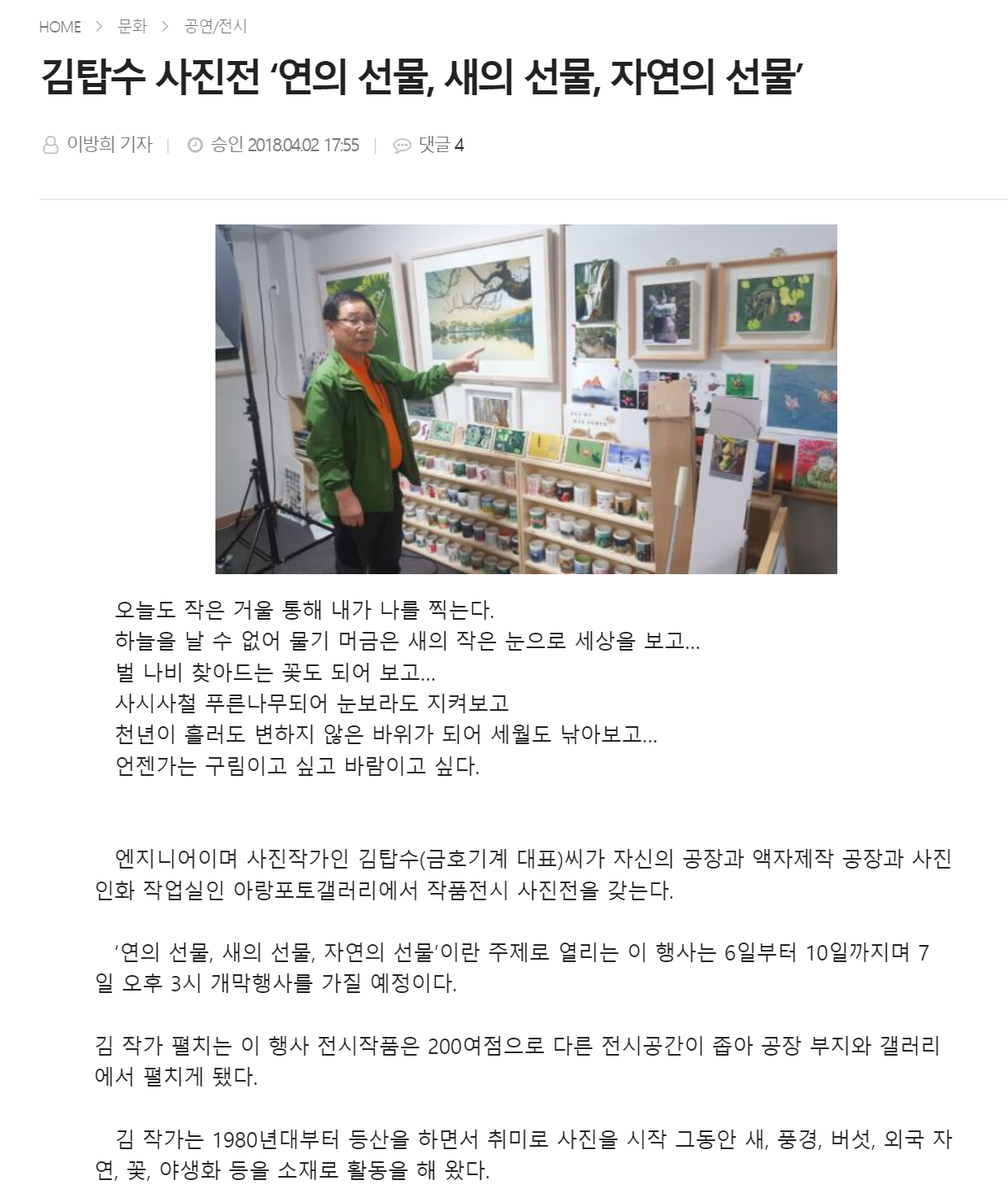뿐만 아니라 해당 뉴스는 2012년도 뉴스이지만 2018년도에는 또 새의선물이라 타이틀로 사진전을 개최를 했다고 하네요.