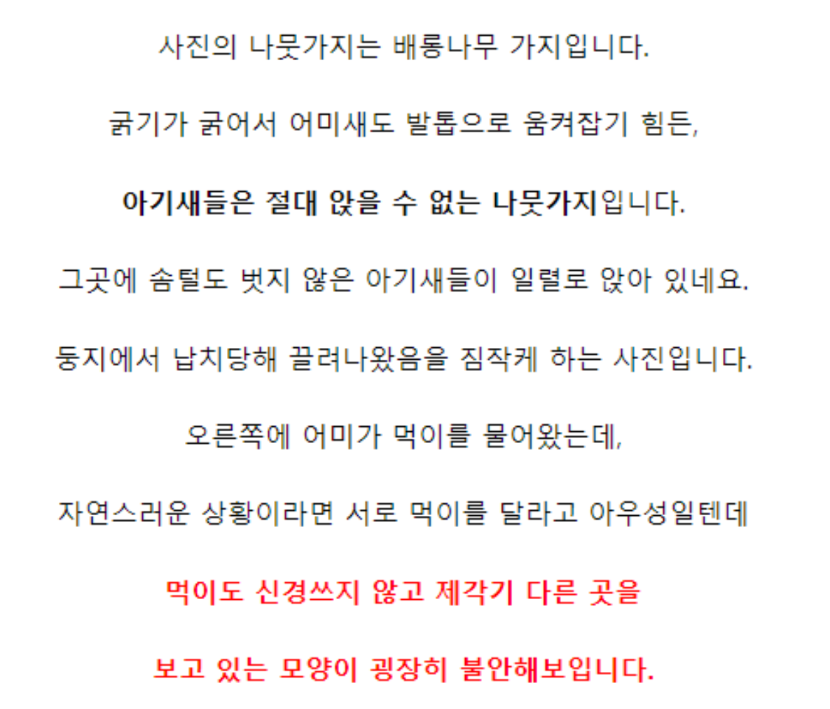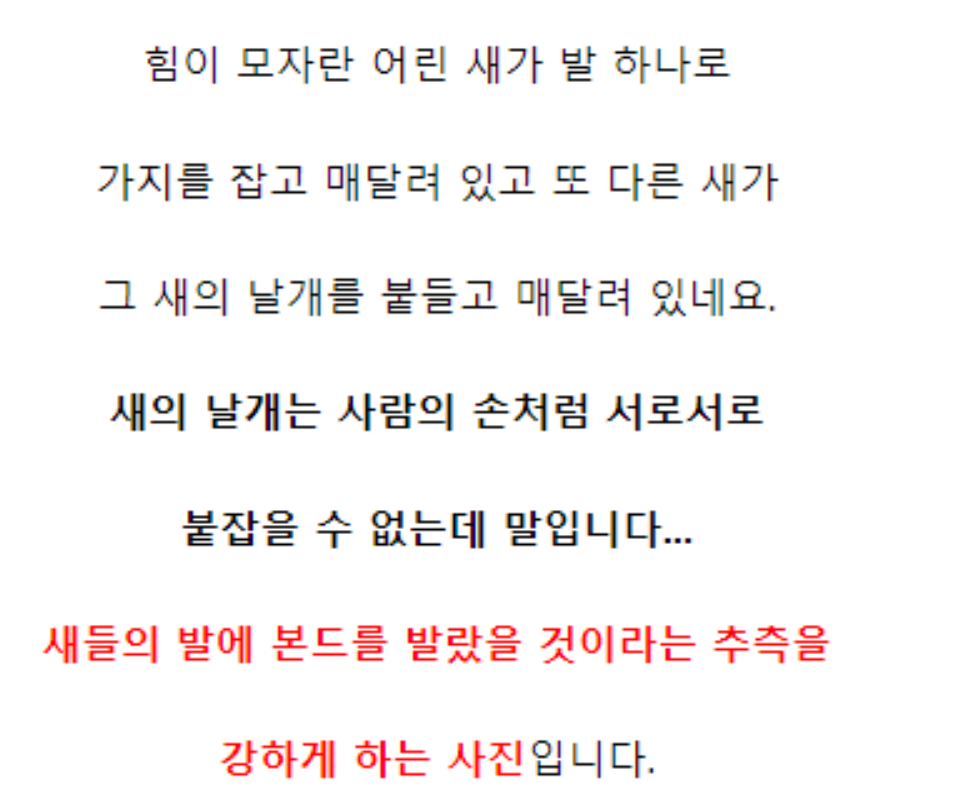 아기새가 발 하나로 가지를 잡고 매달려 있고 또 다른 새가 그 새의 날개를 붙들고 매달려 있는 사진인데 새의 날개는 사람의 손처럼 서로 붙잡을수가 없는것은 초딩들도 알수 있는 것이죠.