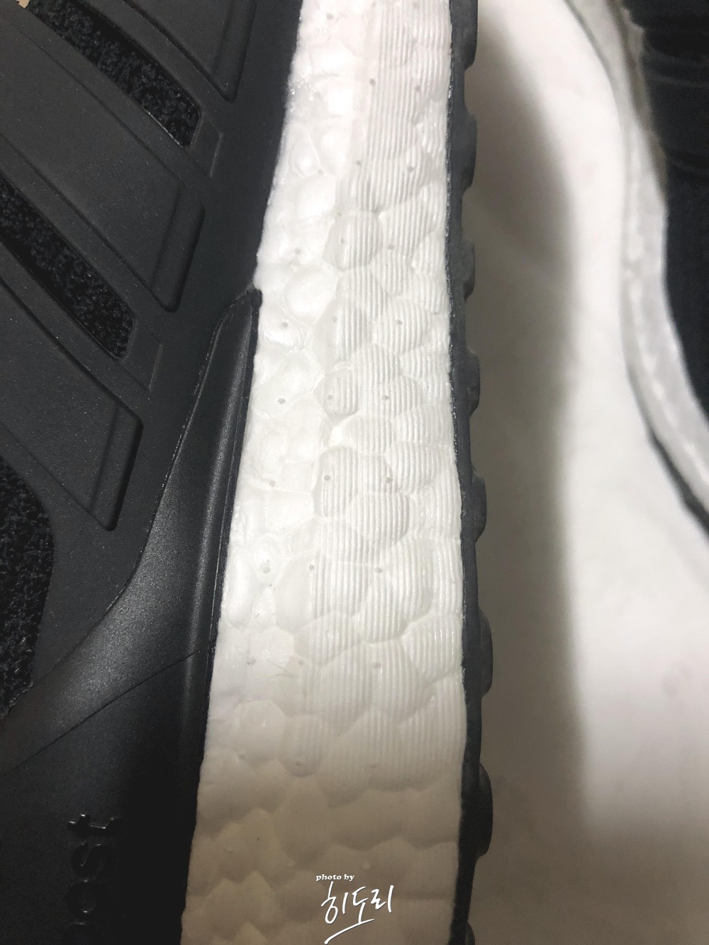 울트라부스트 3.0은 흰색과 검정의 조화가 돋보이는 디자인입니다. 특히 옆쪽 라인에는 "ultra boost"라고 적혀 있으며, 흰색 스폰지 부분이 바로 부스트폼 부분입니다. 이지부스트와 동일한 타입의 신발로, 이지부스트보다 더욱 쫄깃한 착화감을 제공합니다.