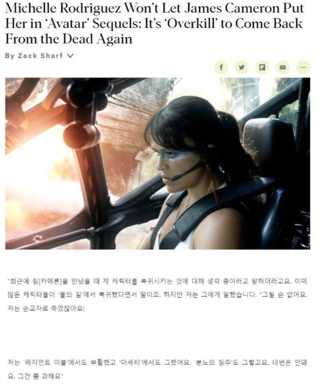 그래서 미셸 로드리게스는 4번이나 부활하는 캐릭터를 맡는것은 부담이 되었는지 아바타2에는 출연하지 못했습니다.