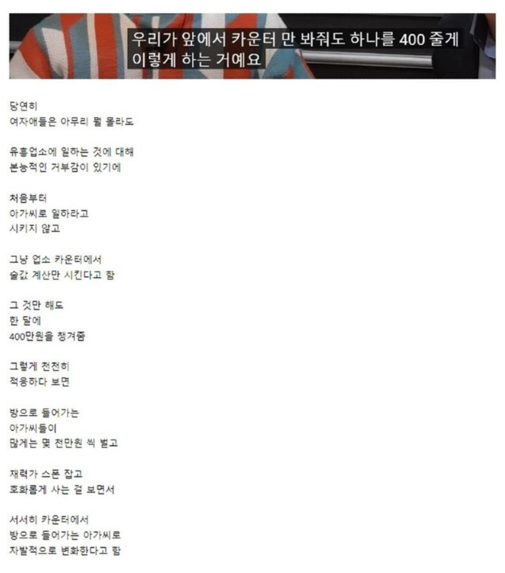당연히 아이들도 거부감이 있어서 바로 일을 하는것이 아니라 처음에는 카운터를 맡기고 술값 계산만 하다가 다른 언니들이 몇천만원씩 보는것을 바라보며 자발적으로 조금씩 변화가 된다고 합니다.