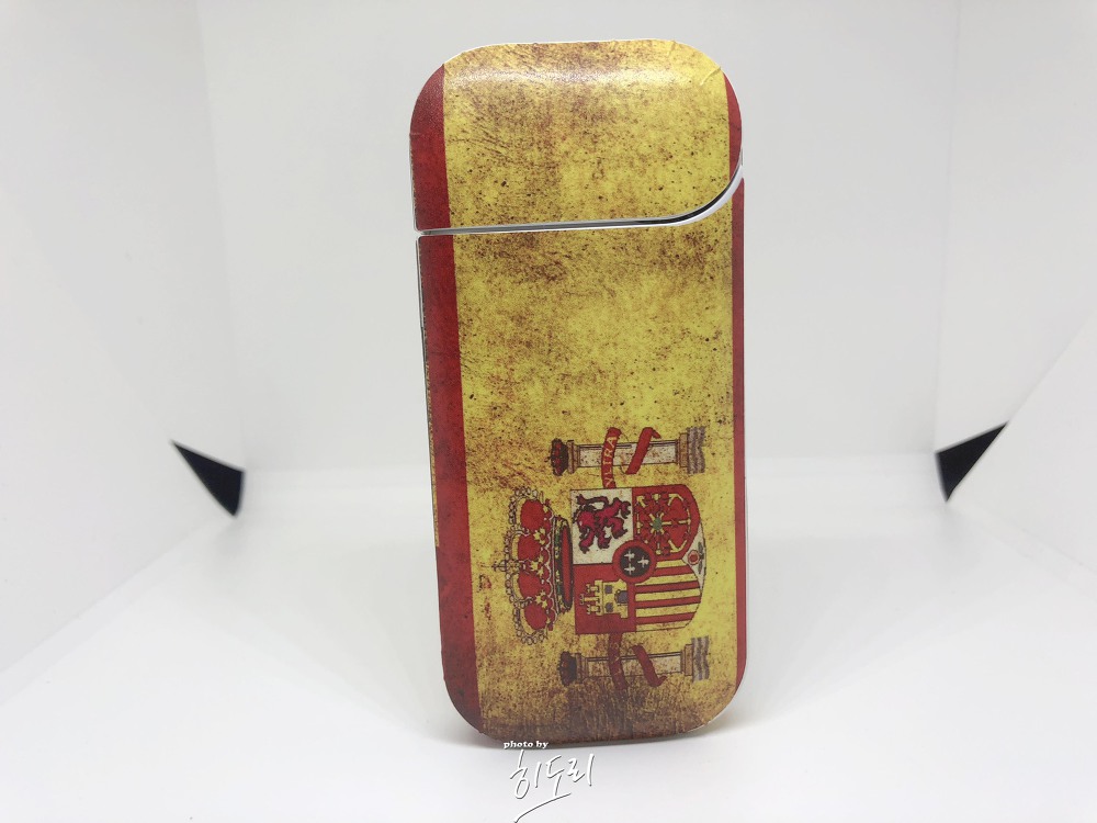 랩핑 작업을 마친 아이코스의 모습은 정말 새 제품처럼 변했습니다. 스티커가 기기에 딱 맞게 제단되어 있어, 뚜껑 부분부터 옆면, 본체까지 모든 부분이 깔끔하게 맞아떨어집니다. 특히 빈티지풍의 스페인 디자인은 너무나도 마음에 듭니다. 이제 더 이상 잔기스나 더러워진 부분을 신경 쓰지 않아도 되고, 기기가 훨씬 멋스러워졌습니다.