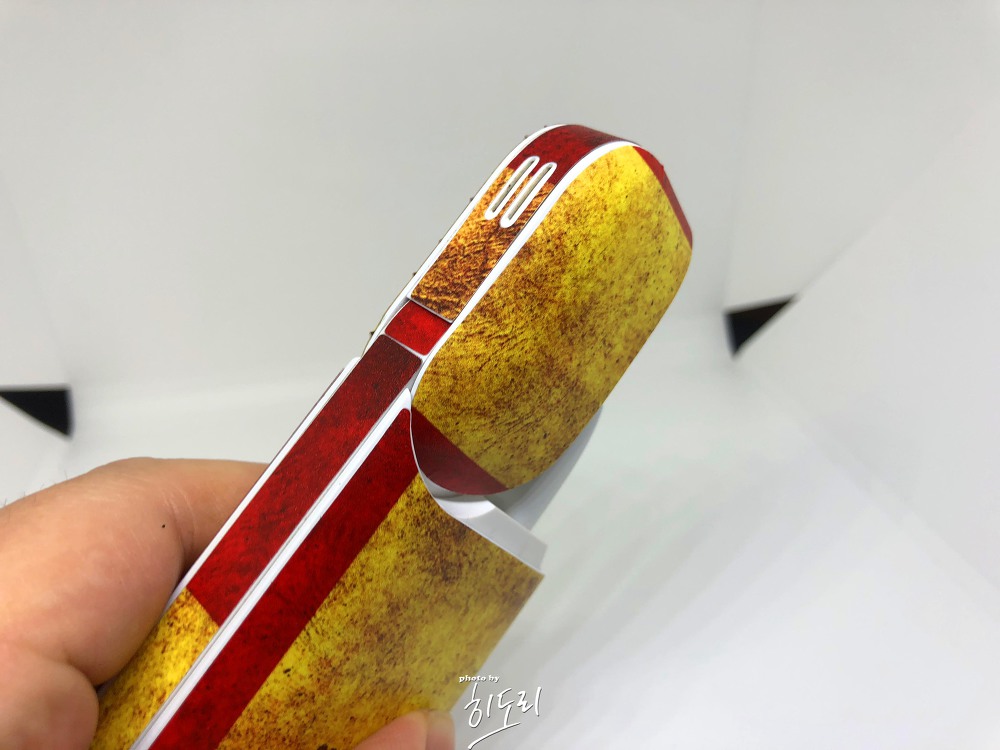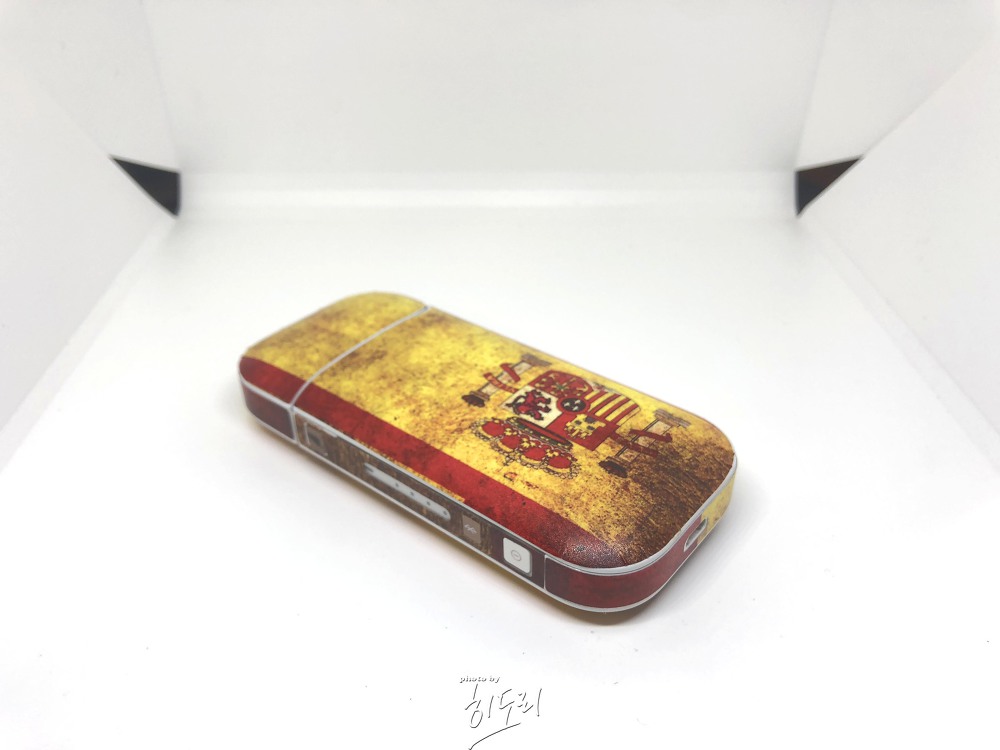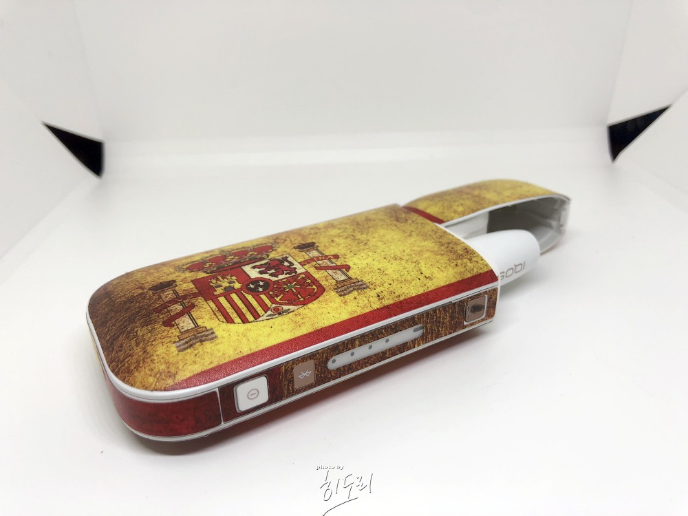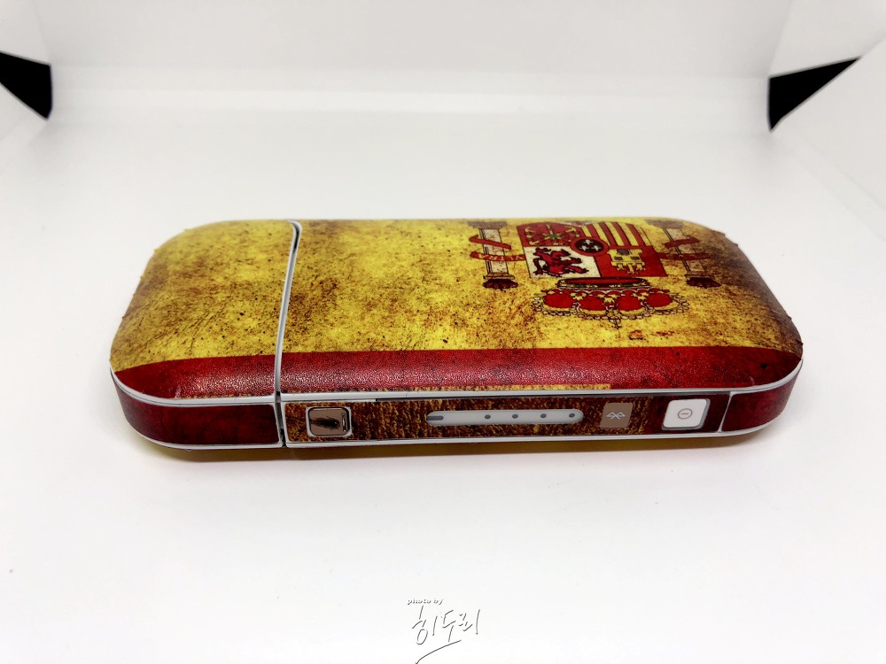 랩핑 작업을 마친 아이코스의 모습은 정말 새 제품처럼 변했습니다. 스티커가 기기에 딱 맞게 제단되어 있어, 뚜껑 부분부터 옆면, 본체까지 모든 부분이 깔끔하게 맞아떨어집니다. 특히 빈티지풍의 스페인 디자인은 너무나도 마음에 듭니다. 이제 더 이상 잔기스나 더러워진 부분을 신경 쓰지 않아도 되고, 기기가 훨씬 멋스러워졌습니다.