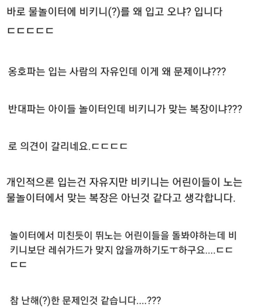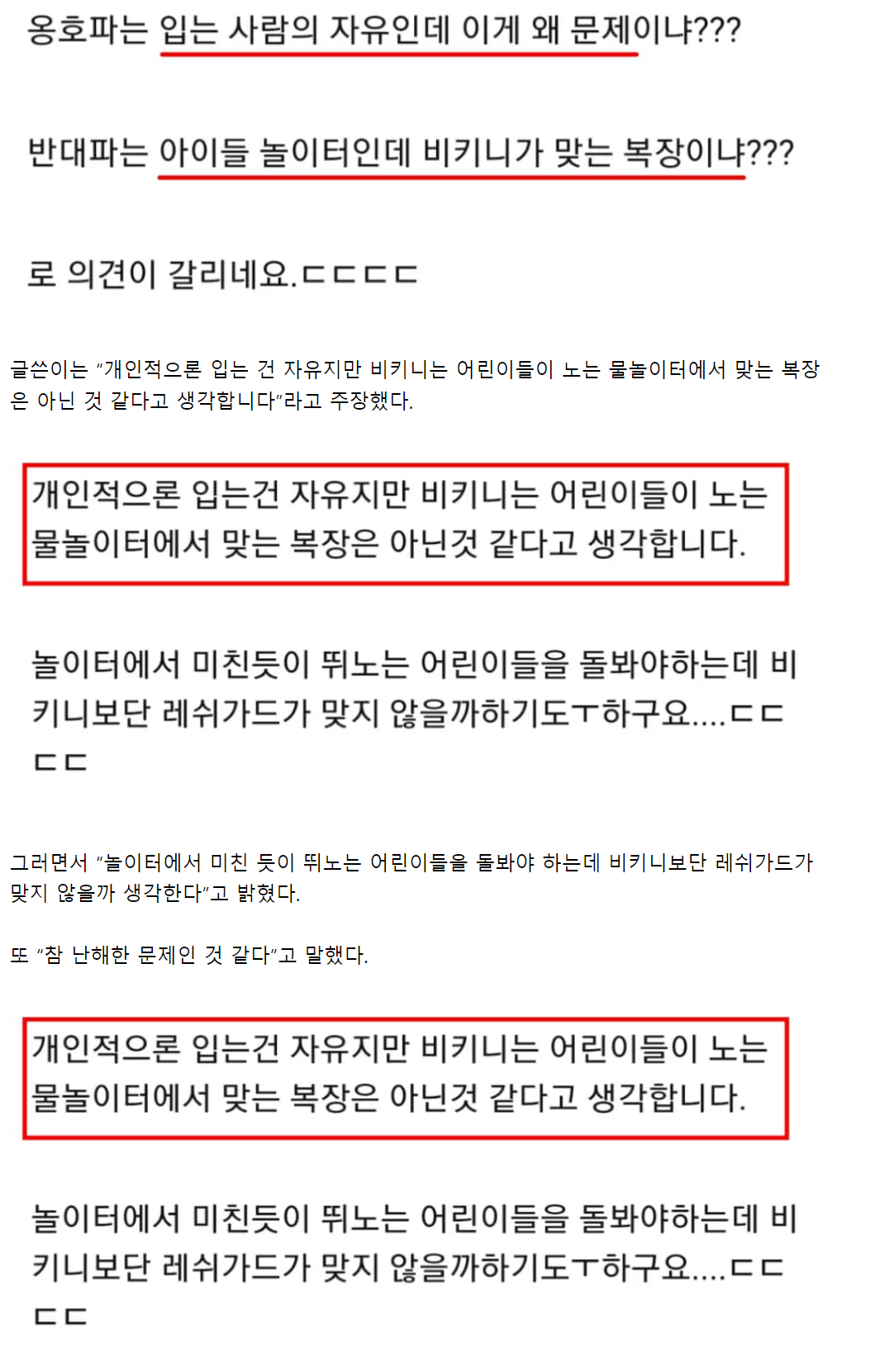 아이들이 노는 놀이터인데 비키니 복장이 말이 되냐고 하는 사람도 있습니다.