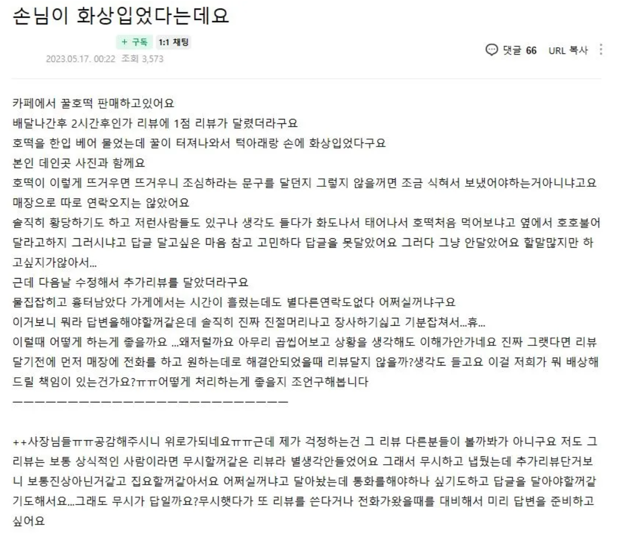 어질어질한 자영업... 꿀호떡 때문에 화상입었다는 손님