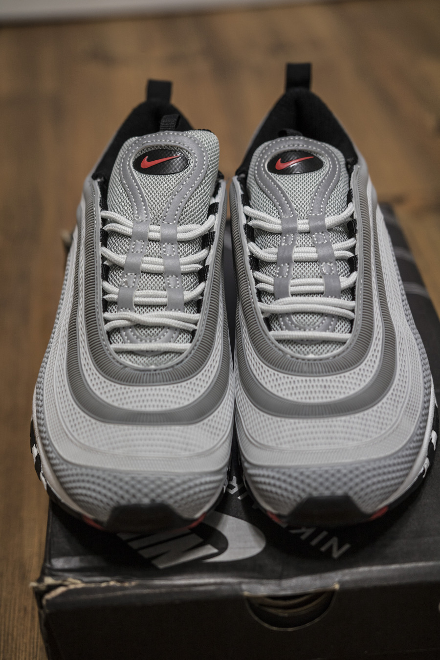 원래는 은갈치 모델을 다시 구입하고 싶었지만, 프리미엄 가격이 붙어있고 정발이 되지 않아 구하기 어려웠습니다. 그래서 이베이를 통해 약간 수정된 새로운 에어맥스 97 모델을 구매했습니다.