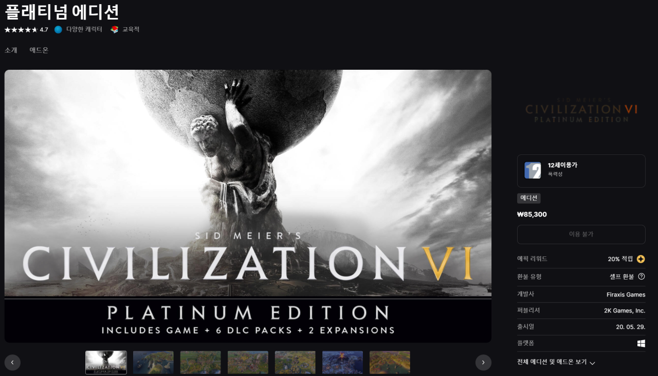 에픽게임즈에서 예전에 문명6 기본판을 무료로 뿌렸던 적이 있었는데,