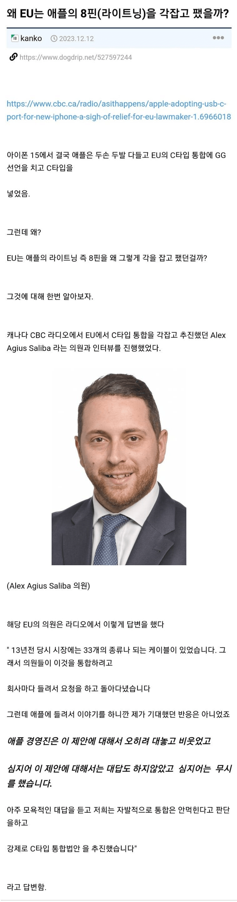 그는 이어서 "애플의 경영진은 우리의 제안에 대해 대놓고 비웃었고, 심지어는 대답조차 하지 않거나 무시했습니다. 이러한 모욕적인 반응을 받고 나서 우리는 자발적인 통합은 어렵다고 판단했습니다. 그래서 강제로 C타입 통합법안을 추진하게 되었습니다."라고 덧붙였습니다.