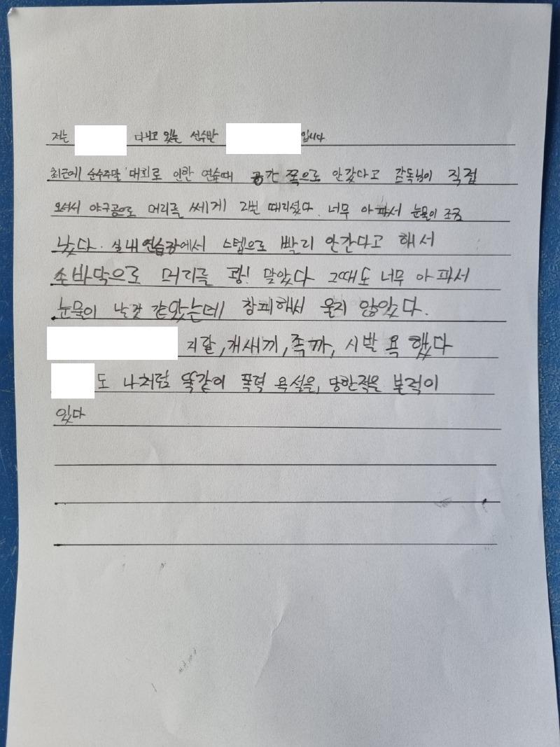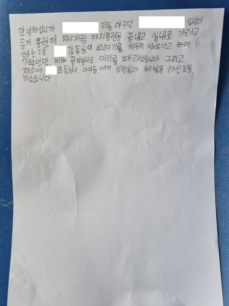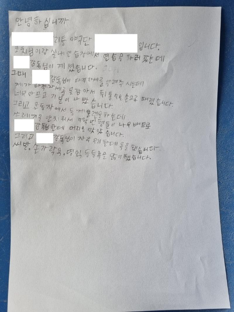 해당 학부모는 "공을 못 받거나 놓치는 아이들에게 야구공을 던지고, 욕설은 기본이며, 쓰레기를 안 치우면 야구방망이로 머리를 때린다"고 주장하며, "그것도 같은 운동장을 공유하는 타팀의 감독에 의해 일어나고 있다"고 덧붙였다.