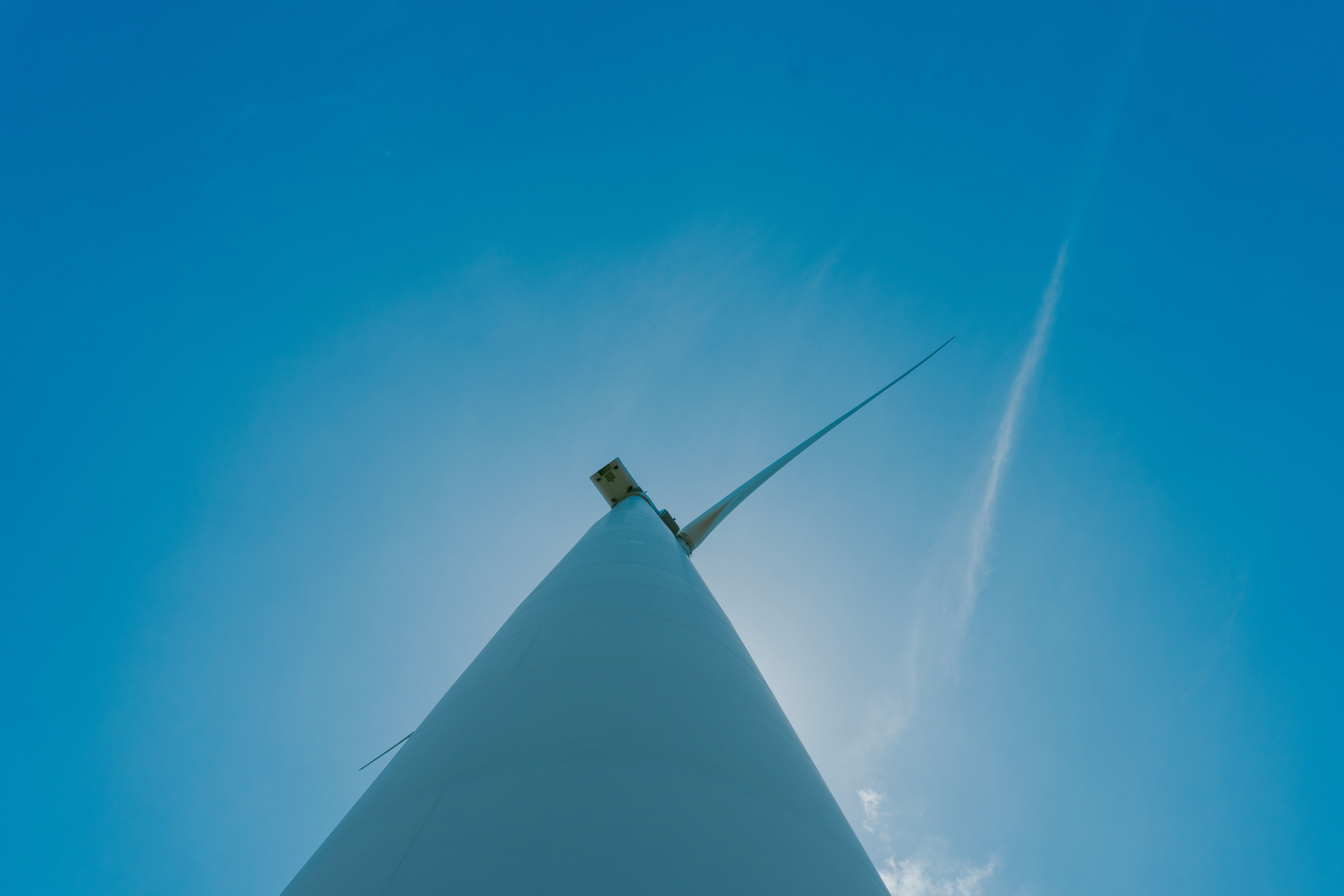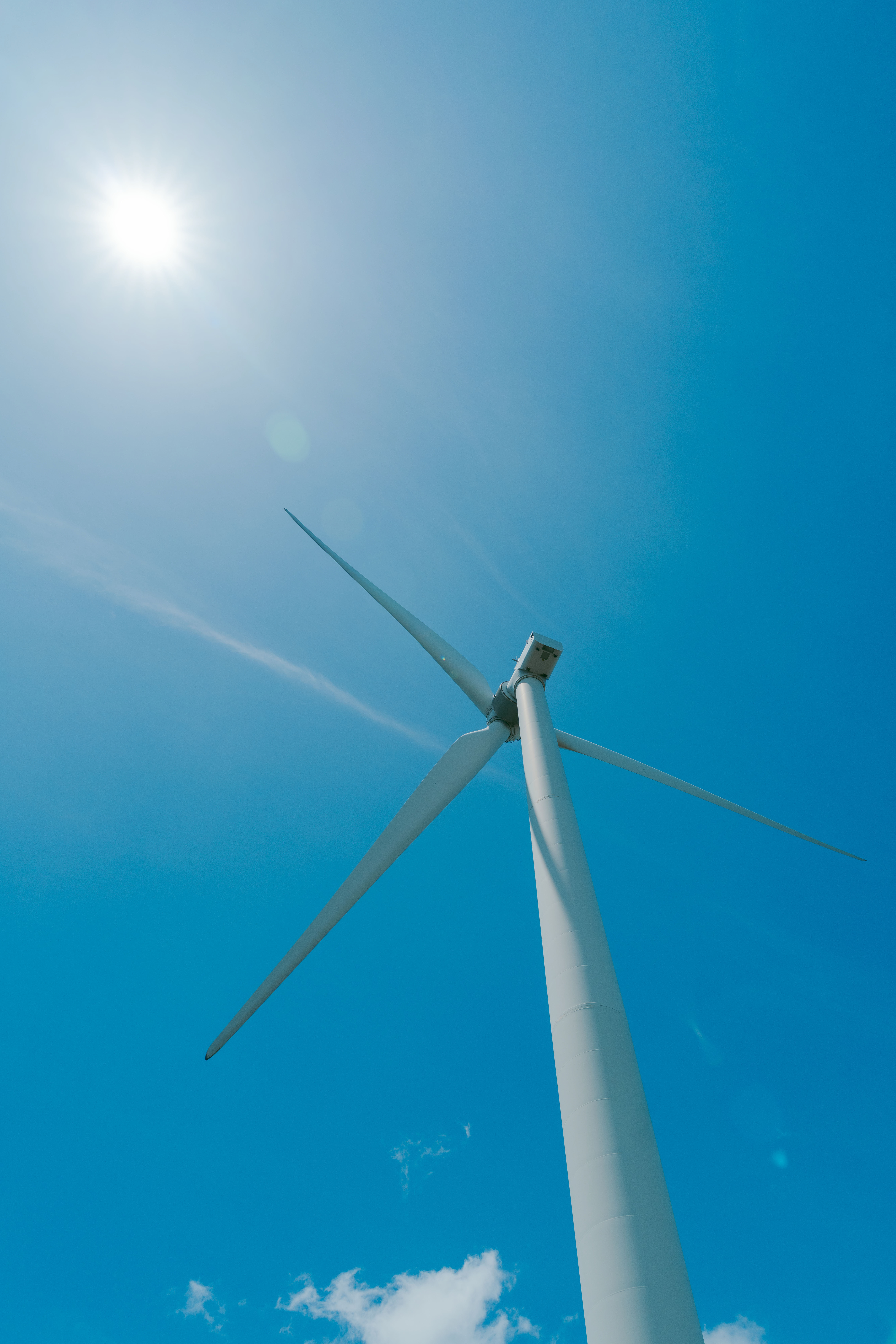 다음 사진은 푸른 하늘 아래에 늘어선 거대한 풍력 터빈들을 촬영한 것입니다.
