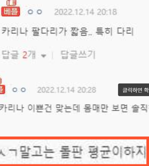"셀카나 인스타가 아니더라도 실물이나 비율이 좋던데 왜 성희롱하냐", "이런 글 보면 본명을 안 쓰길 잘했다. 언니 힘내요!" 등 다수의 비판적인 댓글과 응원 메시지가 이 게시글에 달렸습니다.