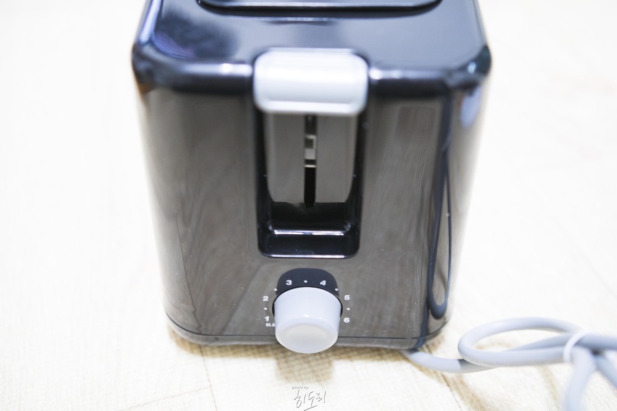 유파 토스터기의 전체적인 외관입니다. 윗부분에 먼지 덮개가 있어 사용하지 않을 때 먼지가 들어가는 것을 방지할 수 있습니다. 스위치는 토스터기 답게 팝업형 스위치로, 다이얼을 통해 1단계부터 6단계까지 조절할 수 있습니다.