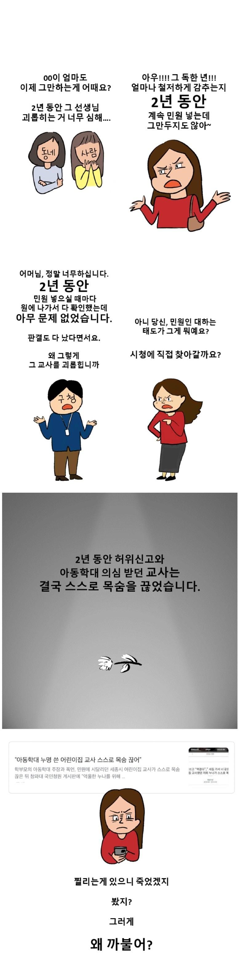 어린이집 선생님을 한 학부모가 2년간 괴롭혀서 결국 죽음에 내몰게 된 사건...