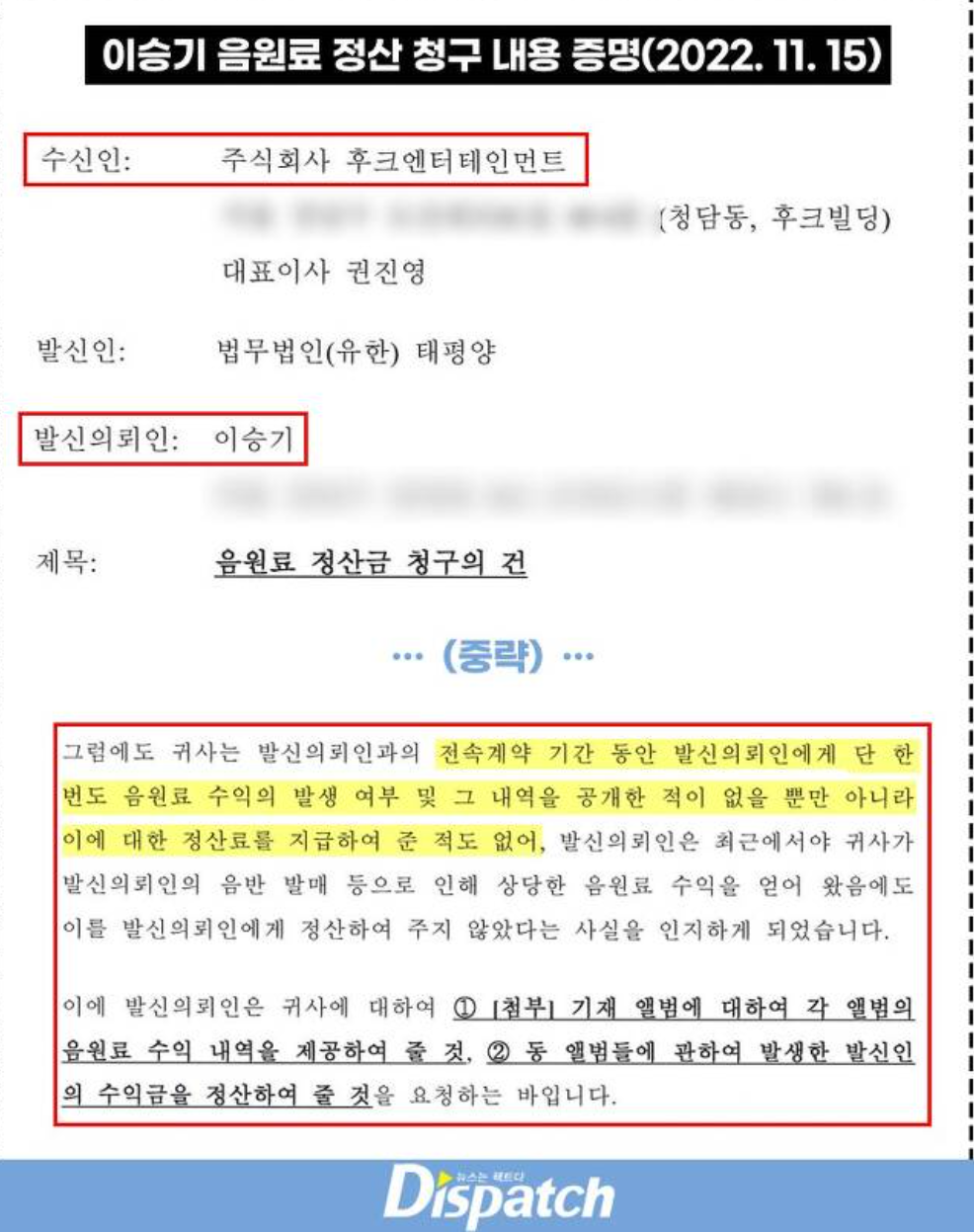 이승기가 데뷔 이래 소속사로부터 음원 수익 정산을 한푼도 받지 못해 이승기가 보낸 내용증명에 이를 따져 묻는 내용이 담겨져 있습니다.