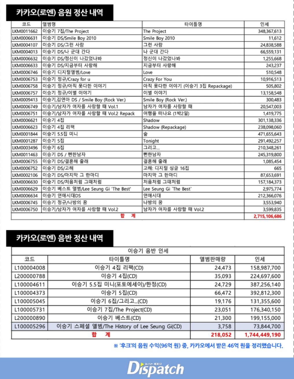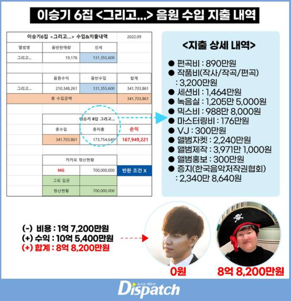 하지만 이승기는 음반 정산이 0원이라고 합니다.