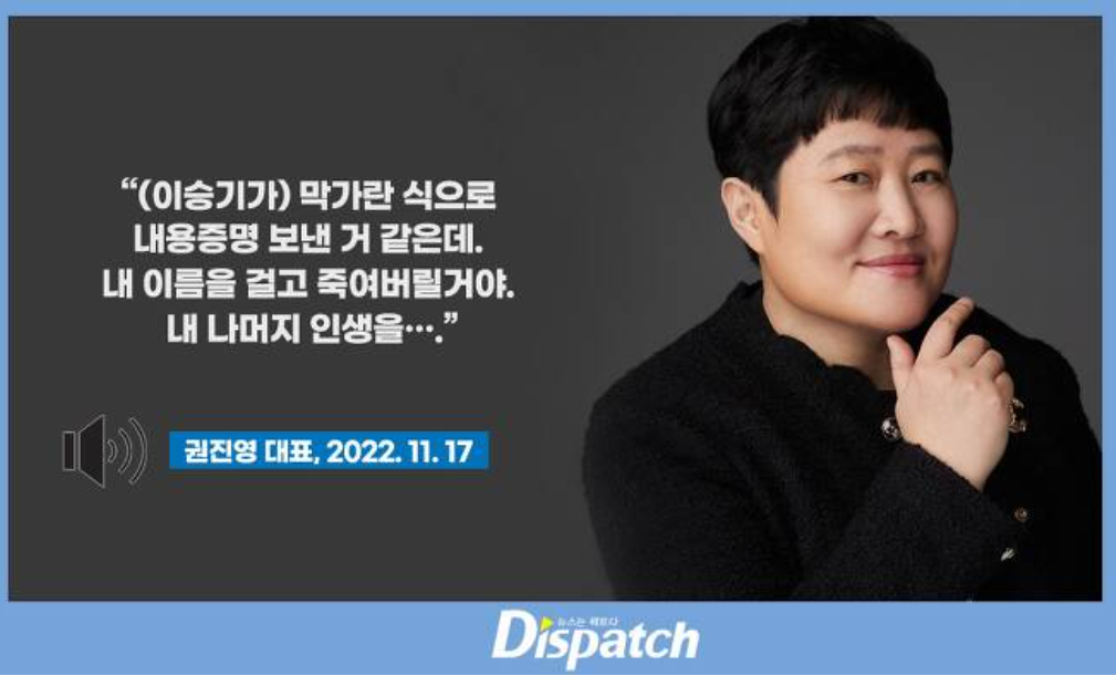 이승기, 이승기 부모, 이승기 매니저, 이승기 지인. 권진영 대표님은 이 모든 사람을 평생 무시하셨습니다. 제 사람들 더는 무시 안 당하게 제가 용기 내야겠습니다. 대표님의 음해와 협박으로 제가 연예인 못한다면 그것 또한 제 운명이겠죠. 이사님과 더 나빠지고 싶진 않습니다. 앞으로 변호사를 통해 연락해 주십시오."