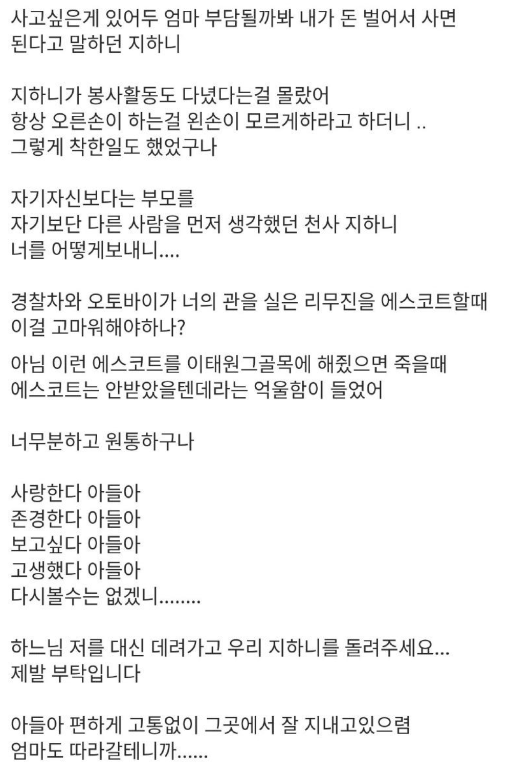 그리고 이지환씨의 어머님이 SNS을 통해 아들에게 보내는 편지도 공개가 되었습니다.