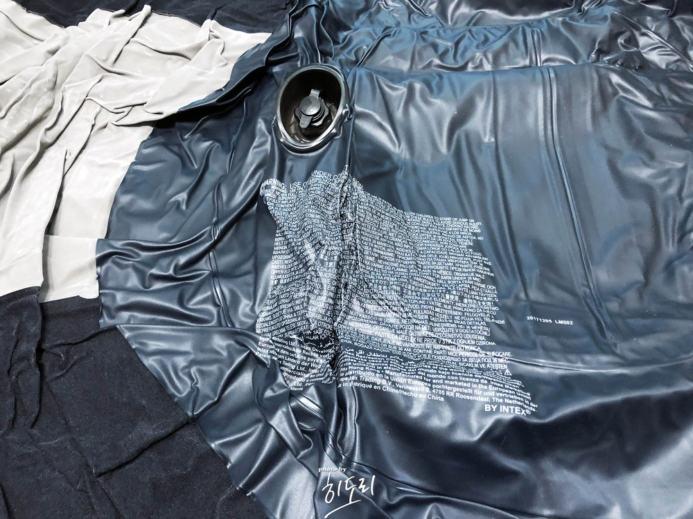 박스를 열어보니 다국어 설명서와 튜브 펑크 패치, 본체가 가지런히 접혀 들어있습니다. 후기들 보면 고무 냄새 이야기가 많던데 제 건 생각보다 약했어요. 환기 한두 번 시켜주고 바로 사용해도 무난한 정도였습니다.