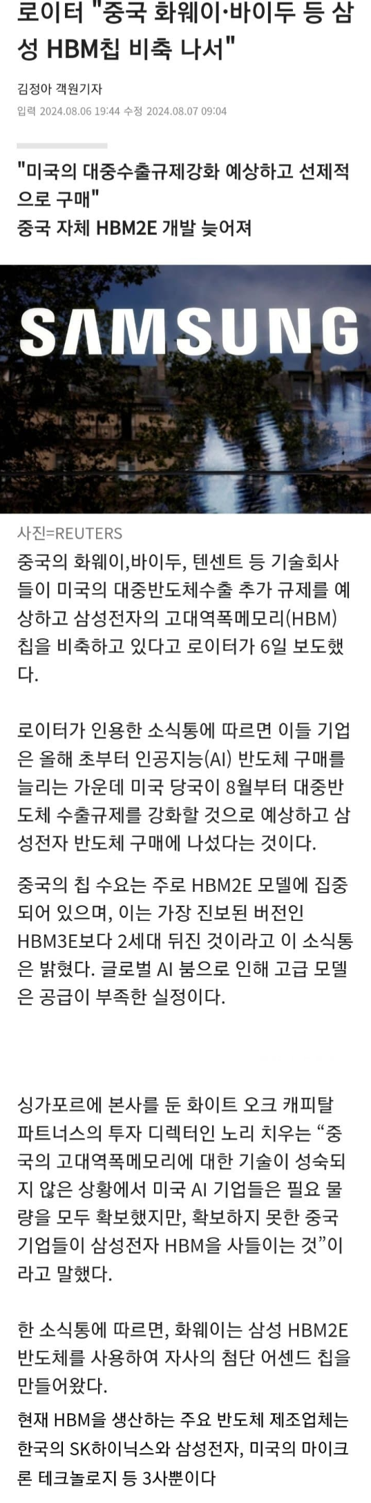 재미있게도, 중국은 아직 2세대 뒤처진 HBM2E 칩조차 개발하지 못하고 있어요. 이 때문에 화웨이를 비롯한 중국의 IT 기업들은 삼성과 SK하이닉스의 반도체 없이는 제품 생산과 해외 수출도 어려운 상황입니다.